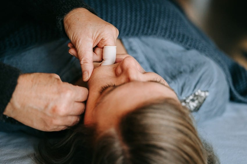 Derfor arbejder jeg både med mindfull touch – en blid berøring, hvor jeg hjælper muskler til at spænde af i ansigtet, og med biodynamisk kranio-sakral terapi på led og knogler.