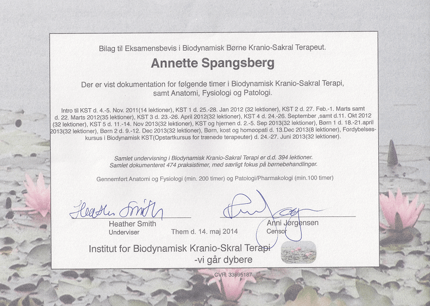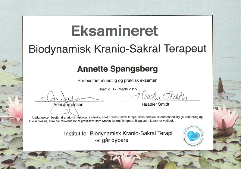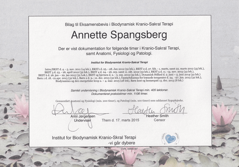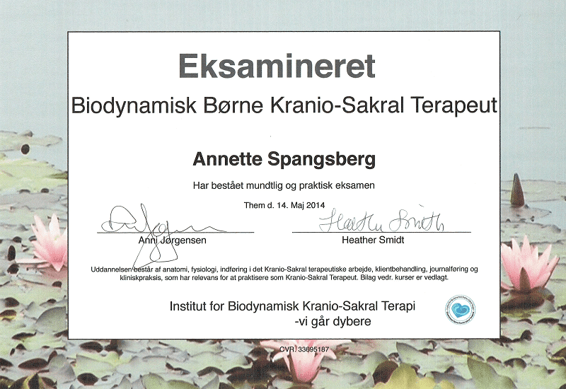 Annette Spangsberg har taget to eksaminer indenfor Biodynamisk kranio-sakral terapi – henholdvis til babyer/børn og til voksne.