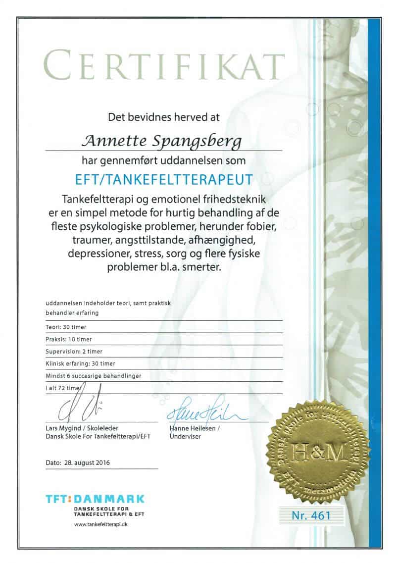 Foruden de to eksaminer i Biodynamisk kranio-sakral terapi, er Annette Spangsberg også certificeret Biodynamisk Touch Terapeut. En række kurser udover dem, der kræves for at gå til eksamen, giver certifikatet.